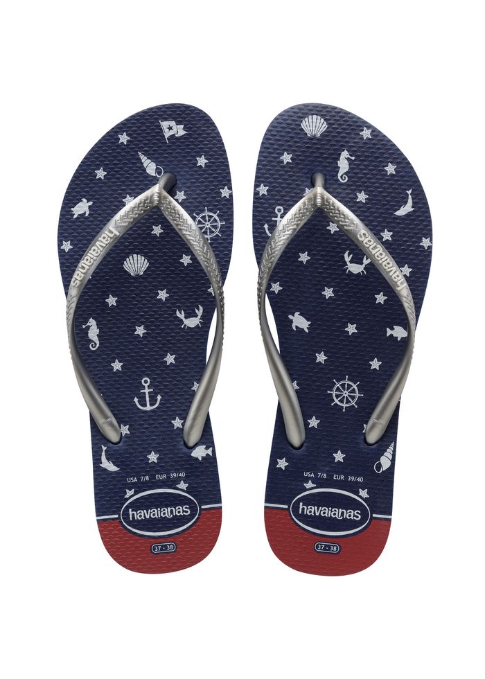 Inspired by the classic navy style, Havaianas Slim Nautical feels like navigating calm seas. It comes with two prints that explore this trend with stripes, anchors and marine animals. Its palette elegantly mixes blue, white and red.